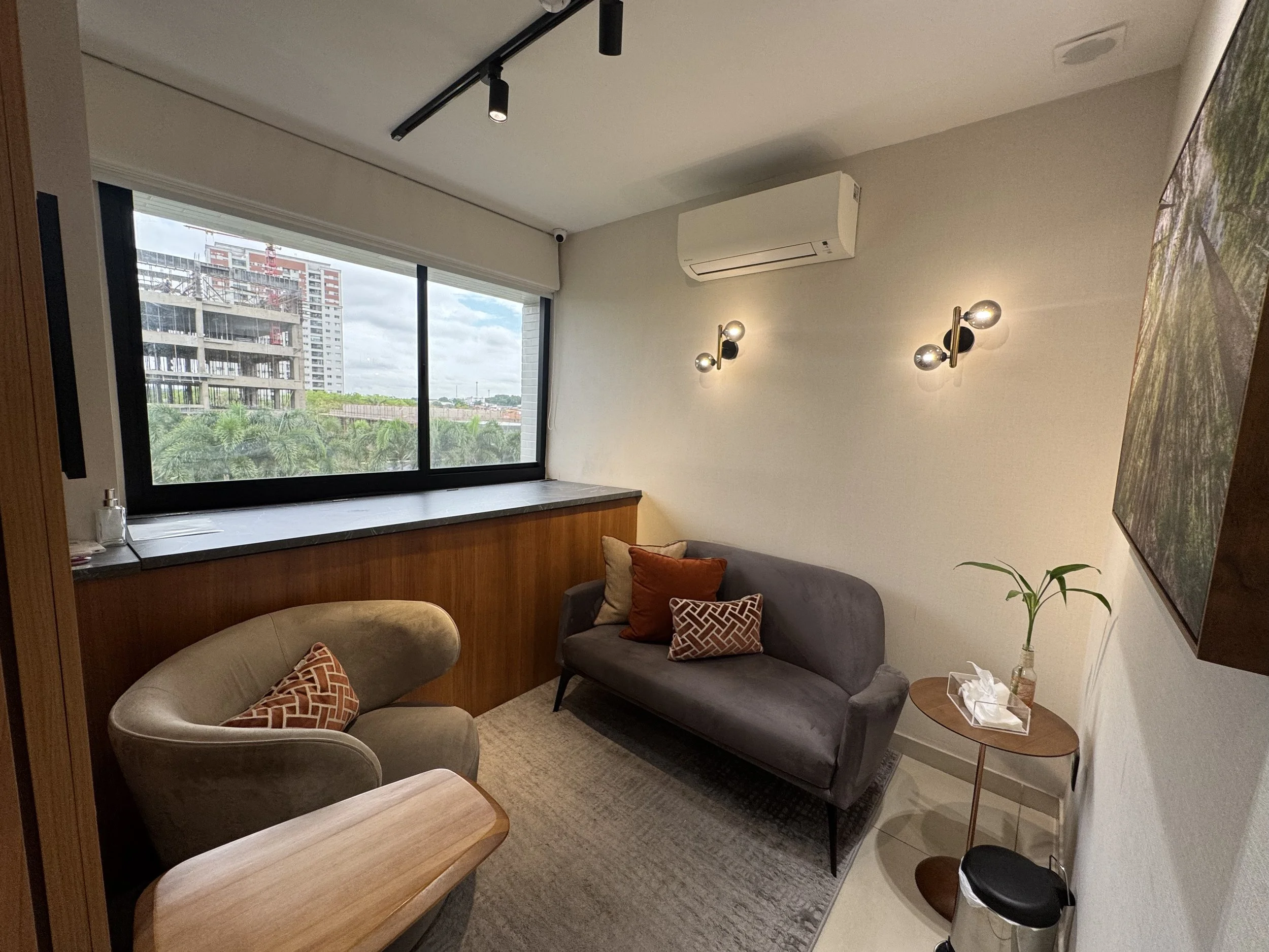 Com climatização adequada, ambientação harmoniosa e recursos tecnológicos integrados, o espaço oferece praticidade ao profissional sem perder o cuidado com o conforto e a sensibilidade que esse tipo de atendimento exige. A iluminação suave e a composição do mobiliário criam uma sensação de acolhimento, contribuindo para que o paciente se sinta à vontade durante todo o processo terapêutico.